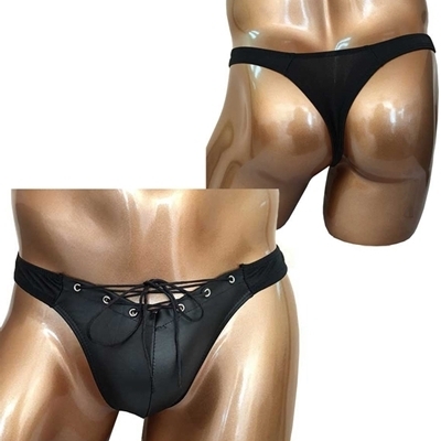マットな光沢感が魅惑的!立体縫製で包み込むお洒落な男性用Tバック。ハトメ金具に紐を通しレースアップしたスタイリッシュなデザイン♪バックはタンガデザインで、引き締まったお尻をアピールします。ブラックカラー、フリーサイズ