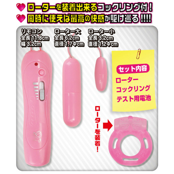 小型ローターをコックリングにセットし、電動と化したリングをムスコに装着したまま、もう一方のスティックローターで乳首やクリトリスも刺激可能!もちろん、それぞれ単品で使用しても十分楽しめます。
