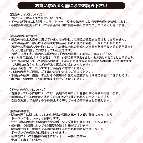 ●65cmの低身長ボディ●安全なエラストマー素材を採用●各関節が曲げられて様々なポーズが可能●ヘアカラーは4種類、アイカラーは3種類の中から1つ選択OK●ドール本体に膣内構造形成済み●オーラルセックス不可●リアルさを増す専用ランジェリーもセット。