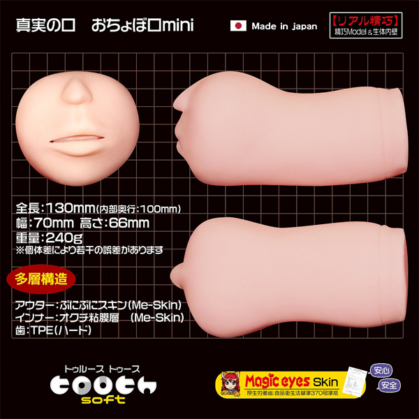 ふわっと柔らかい!元祖「真実の口」よりミニサイズが登場!未経験のような優しさと下手くそさを再現した日本製の非貫通オナホ♪手に馴染みやすいハンドサイズで喉の奥行は10cmと短め。