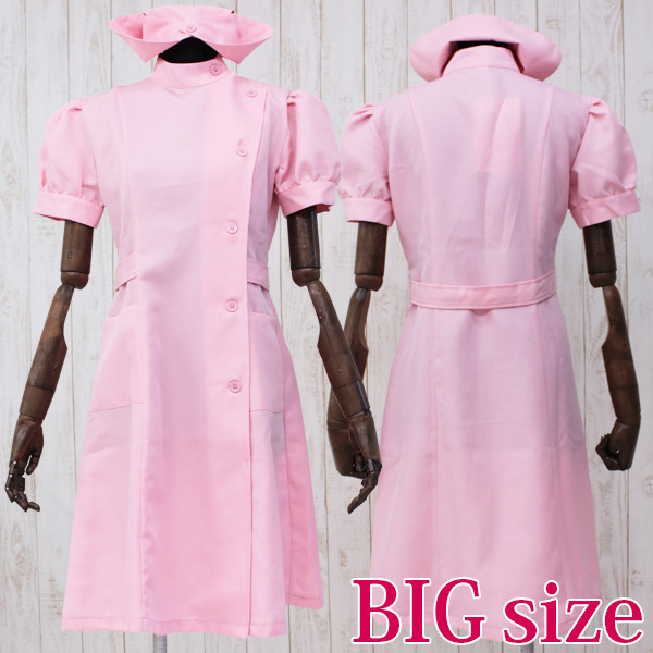 BIGサイズ:B98〜108cm・W86〜96cm ワンピース:着丈110cm 肩幅48cm 首周り45cm 袖丈28cm 袖口周り35cm セット内容:ワンピース(前ボタン留め・立て襟・ポケット付き・裏地無し)、ナースキャップ 素材:ポリエステル100%