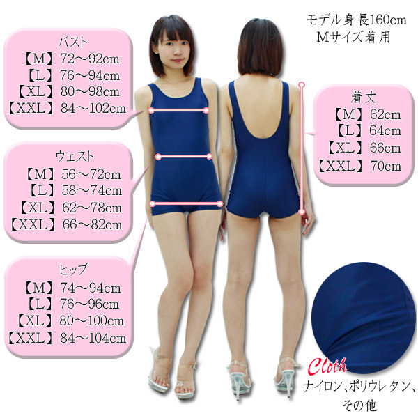 XXLサイズ:B84〜102cm・W66〜82cm・H84〜104cm 着丈70cm セット内容:水着単品(前身頃全面に裏地付き、胸部にパット付き) 素材:ナイロン、ポリウレタン、その他
