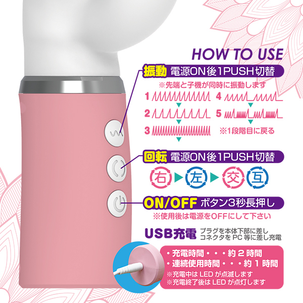 思いやりで愛を育もう♪充電時間:約120分/連続使用時間:約60分(使用状況や環境により時間が変わる場合があります)・振動…5段階・回転…3段階・エラストマー製・生活防水・USB充電式
