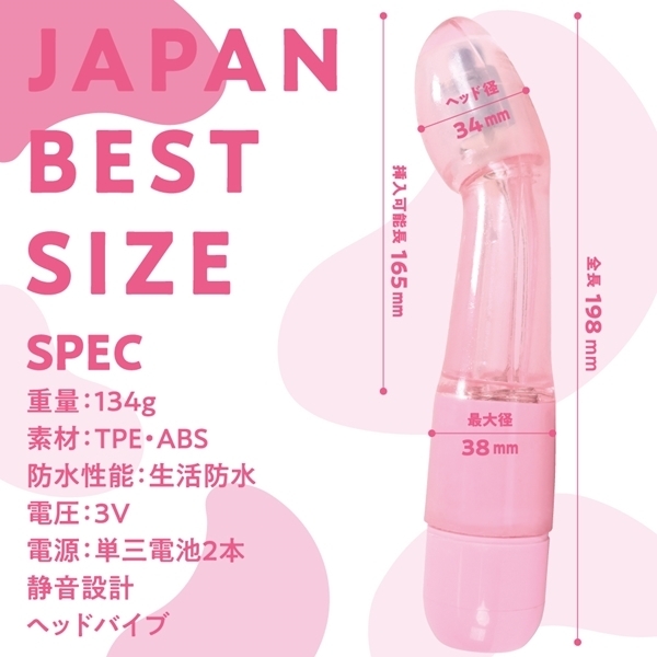 パッケージ:22.9×6.8×4.5cm 本体:全長19.8cm・挿入可能長16.5cm・ヘッド径3.4cm・最大径3.8cm 重量:134g 電池:単三電池×2本使用