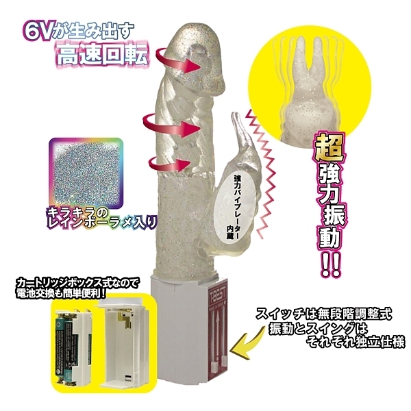 快感は無限に輪廻する…復活を遂げたくねりん棒シリーズから扱いやすいミドルサイズのハイパワーVER.が登場!レインボーラメも入ってキラッキラ☆彡6Vハイパワーが生み出す高速回転で、くねくねグリグリ ぐるぐるとこねくりまわす動きにもうメロメロ!絶頂、即イキ間違いなし!!さらに子機バイブは強力ローター内蔵で先端の突起がブルブル、ク●も同時に快感刺激!!電池を入れればすぐに使える楽々コントロールBOX、しかもカートリッジ式で電池交換も簡単便利!スイッチは振動とスイングがそれぞれ独立、無段階調整式でお好みの速度でお楽しみいただけます。