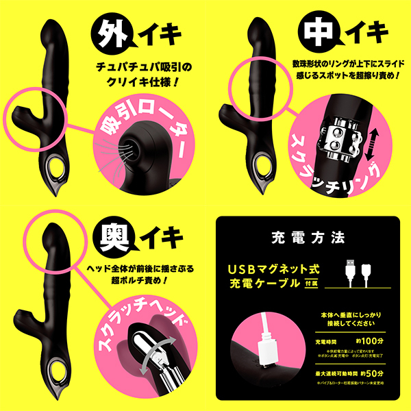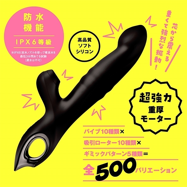気持ちイイとこ全部責め♪究極ギミック搭載で奥イキ・中イキ・外イキ革命!ヘッドが前後に揺さぶり超ポルチ責めするスクラッチヘッドギミック!数珠形状のリングが上下にスライドし、感じるスポットを超擦り責めするスクラッチリングギミック!チュパチュパ吸引でクリイキ仕様の吸引ローター!バイブ振動10種類に吸引ローター10種類、ギミックパターンが5種類で脅威の全500バリエーションで楽しめます。